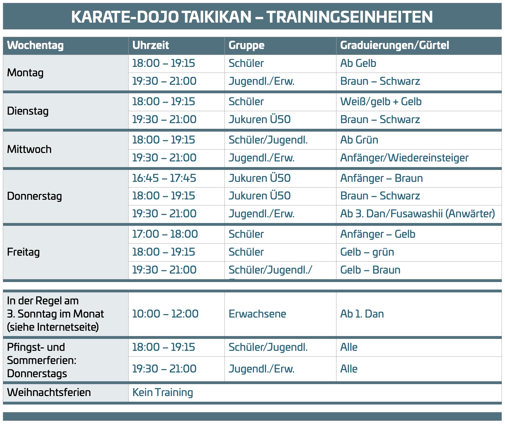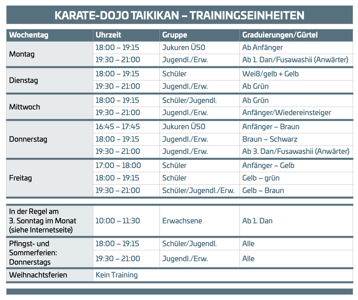 Oberstufe ab Schwarzgurt / 10.00 – 11.30 Uhr / In der Regel am 3. Sonntag im Monat. An Feiertagen und/oder sonstigen Anlässen, findet das Training eine Woche später statt. Aktuelles, Änderungen und Themen unter: TermineTrainingseinheiten (PDF)